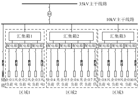 微網(wǎng)分為3塊區(qū)域,均為大工業(yè)用戶,電壓等級(jí)為10kV,最大負(fù)荷為11.13MW。項(xiàng)目壽命周期為20年,設(shè)備綜合造價(jià)及相關(guān)成本參考當(dāng)?shù)貥?biāo)準(zhǔn),基準(zhǔn)折現(xiàn)率取7%。傳統(tǒng)運(yùn)營(yíng)模式下微網(wǎng)項(xiàng)目總投資約1.62億元,其中源側(cè)約14500萬(wàn)元,網(wǎng)側(cè)投約310萬(wàn)元,儲(chǔ)側(cè)約900萬(wàn)元,信息化平臺(tái)(能量管理系統(tǒng))約500萬(wàn)元;一體化運(yùn)營(yíng)模式總投資約1.68億元,其中源網(wǎng)儲(chǔ)側(cè)投資變化不大,信息化平臺(tái)(大數(shù)據(jù)云計(jì)算平臺(tái)、微平衡市場(chǎng)交易系統(tǒng)、能量管理系統(tǒng))約1100萬(wàn)元。圖7為微網(wǎng)接線方案示意圖。