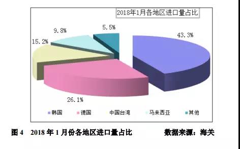 第二,從德國進(jìn)口量位居高位。1月份從德國進(jìn)口量為4252噸,環(huán)比增加11.7%,占總進(jìn)口量的26.2%,1月份進(jìn)口量實(shí)際為12月份交易情況,而2017年12月份下游需求仍維持火熱,因此從德國進(jìn)口量位居高位。