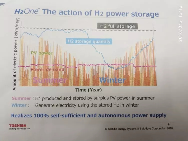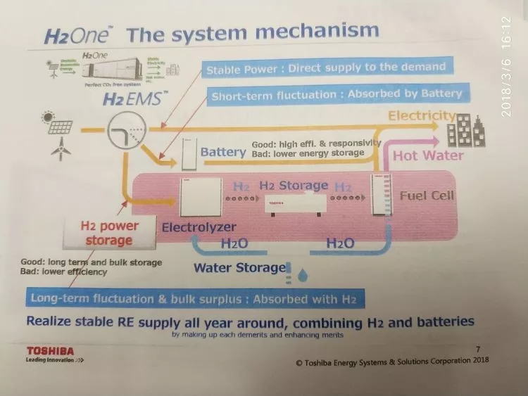 在正常的非緊急操作中,通過優(yōu)化氫氣生產(chǎn),發(fā)電和儲存控制,H2One的氫能管理系統(tǒng)用于峰值轉(zhuǎn)換,從而減少高需求時的主電源需求。東芝正在努力提高其儲氫能力,以實現(xiàn)當(dāng)?shù)啬茉瓷a(chǎn)的本地消費獨立解決方案。