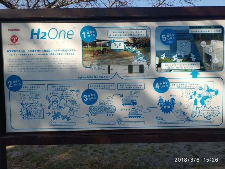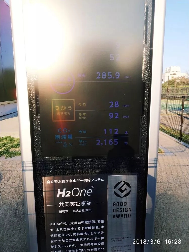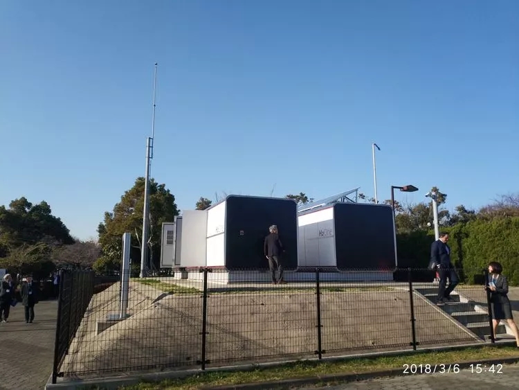 東芝公司H2One示范項目,即氫能能源站項目,是一個以可再生能源為基礎(chǔ)的獨立能源供應(yīng)系統(tǒng),并將氫氣用作發(fā)電燃料。川崎市和東芝已經(jīng)在Kawasaki Marien公共設(shè)施和川崎港區(qū)的東扇島中公園安裝了該系統(tǒng)。今天我們參觀的就是東扇島中公園的示范項目。