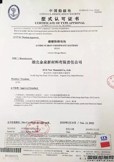 中國儲能網(wǎng)訊:湖北金泉新材料有限責任公司“磷酸鐵鋰電池”近日獲得中國船級社型式認可證書。具體產(chǎn)品型號為LF75、LF90,產(chǎn)品適用范圍為船舶與海洋設施動力用蓄電池。