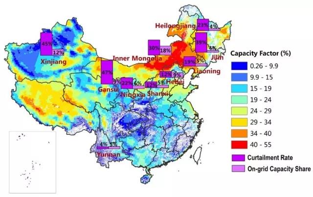 中國儲能網(wǎng)訊:近年來我國很多省份發(fā)生大面積的、嚴(yán)重的棄風(fēng)限電問題,引起各界廣泛關(guān)注。大量清潔、有效的風(fēng)力發(fā)電裝機(jī)在有風(fēng)時不讓并網(wǎng)發(fā)電,導(dǎo)致清潔能源被白白浪費(fèi)。這是我國能源生產(chǎn)革命、清潔能源發(fā)展轉(zhuǎn)型過程中遇到的一個障礙。僅2016年,我國棄掉的潛在風(fēng)電量就高達(dá)500億千瓦時,超過三峽水電站當(dāng)年發(fā)電量的一半。同年,我國平均棄風(fēng)率也高達(dá)17%;換句話說,有17%的風(fēng)電裝機(jī)被迫停擺、得不到任何利用。這不得不說跟經(jīng)濟(jì)新常態(tài)下我國電力部門發(fā)生的產(chǎn)能過剩問題密切相關(guān)。近年來的棄風(fēng)問題主要集中在我國三北地區(qū),即位于我國東北、華北和西北的風(fēng)電裝機(jī)大?。ㄒ娤聢D所示)。另外,17%的棄風(fēng)率也遠(yuǎn)遠(yuǎn)超過國際風(fēng)電大國的正常棄風(fēng)率;后者通常在1-3%的水平。