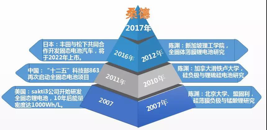 2017年,電池技術(shù)突飛猛進的一年,以鋰電之父約翰·古德諾夫為起點,各大企業(yè)及研究機構(gòu)相繼在“固態(tài)電池”的戰(zhàn)場中亮劍;由寶馬、戴姆勒、通用、大眾、豐田、本田、現(xiàn)代等主流車企牽頭,“固態(tài)電池”駛?cè)肓诵袠I(yè)快車道。
