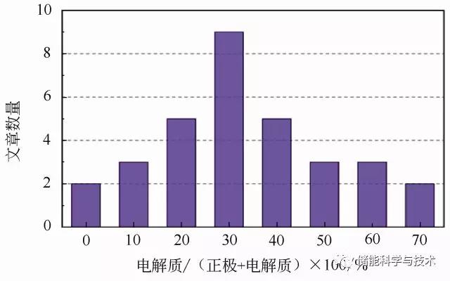 圖3軟包電芯中,正極孔隙率為27%,負(fù)極孔隙率為31%,隔膜孔隙率為40%。正極中,液態(tài)電解質(zhì)占滿了所有孔隙,液態(tài)電解質(zhì)與正極活性物質(zhì)加液態(tài)電解質(zhì)的總質(zhì)量比為7.8%。在2017年發(fā)表的全固態(tài)電解質(zhì)電池的文章中,固態(tài)電解質(zhì)材料與固態(tài)電解質(zhì)加正極活性物質(zhì)總質(zhì)量的比例的文章數(shù)見(jiàn)圖5,可見(jiàn)多數(shù)研究中固體電解質(zhì)的質(zhì)量占比高于10%。這是由于固態(tài)電解質(zhì)材料多以粉體顆?;虮∧さ男问酱嬖谟谡龢O中,而且具備不可壓縮性,固態(tài)電解質(zhì)實(shí)際上會(huì)在正極中占據(jù)更多的體積,這樣會(huì)進(jìn)一步降低全固態(tài)鋰電池電芯的質(zhì)量及體積能量密度。