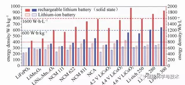 圖7的計(jì)算結(jié)果表明,鈷酸鋰如果充電到4.6 V,可逆容量達(dá)到220 mA·h/g,相應(yīng)鋰電池的體積能量密度可以超過(guò)1900 W·h/L,質(zhì)量能量密度達(dá)到550 W·h/kg;可逆容量達(dá)到300 mA·h/g的富鋰錳基鋰電池的體積能量密度也可以超過(guò)1850 W·h/L,質(zhì)量能量密度甚至高于600 W·h/kg。NCM811、 NCA、4.4 V以上鈷酸鋰質(zhì)量能量密度均有可能超過(guò)400 W·h/kg。目前由于金屬鋰的體積變化、電流密度、低熔點(diǎn)問(wèn)題,即便是采用全固態(tài)電解質(zhì),預(yù)期也很難形成具有競(jìng)爭(zhēng)力的高能量密度且綜合性能滿足實(shí)際應(yīng)用要求的產(chǎn)品。考慮到預(yù)鋰化技術(shù)的成功經(jīng)驗(yàn),采用復(fù)合結(jié)構(gòu)的含鋰負(fù)極材料或許最終更容易實(shí)用化。因此,從綜合技術(shù)指標(biāo)考慮,由于需要在負(fù)極側(cè)引入低容量或無(wú)容量的金屬鋰的載體,圖7計(jì)算的電芯的能量密度會(huì)相應(yīng)的降低。