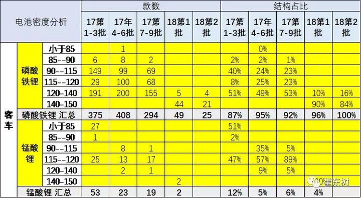 18年客車電池提升很快,磷酸鐵鋰的占比保持95%以上,18年第2批磷酸鐵鋰的電池的能量密度達到120以下為0%.而錳酸鋰也是基本都是高于140。由于客車的競爭相對充分,大部分客車企業(yè)都能實現(xiàn)120的補貼鼓勵要求??蛙嚹壳爸饕N著補貼推動,但高于140瓦/千克的新品也是已經(jīng)成為新品主流。