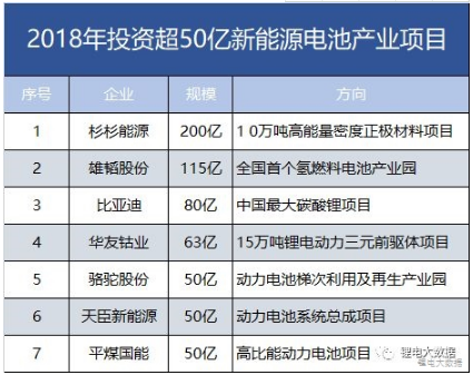 綜述:在2018年新增新能源電池投資項(xiàng)目中,以材料項(xiàng)目偏多,比亞迪、杉杉能源、華友鈷業(yè)斥巨資打造超大型材料項(xiàng)目,以應(yīng)對(duì)未來(lái)的競(jìng)爭(zhēng)變化。猛獅大舉進(jìn)入電池回收領(lǐng)域,以及天臣新能源的動(dòng)力電池系統(tǒng)總成項(xiàng)目,體現(xiàn)了差異化競(jìng)爭(zhēng)的方向。雄韜股份的氫燃料電池產(chǎn)業(yè)園與平煤國(guó)能的固態(tài)電池項(xiàng)目,是區(qū)別于現(xiàn)有的鋰電體系,展示了中國(guó)新能源企業(yè)在不同路線上的努力。