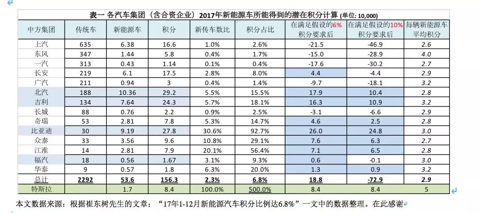 每個法人單位的數(shù)據(jù)不容易獲得,但如表一所示,假如我們設(shè)想2017年需要完成10%的積分要求的話,擁有合資企業(yè)的前五大集團公司都是缺分大戶。假如我們設(shè)想2017年需要完成6%的積分要求的話,五大集團中只有長安有多余積分,但長安和其合資企業(yè)福特需要新能源汽車的正積分來抵油耗標準的負積分。當然第一大戶上汽乘用車本身,不包括合資部分,2017年新能源車積分已達到13%;可以設(shè)想上汽的多余積分會留在集團內(nèi)。所有企業(yè)中,有最多盈余積分的是比亞迪,后面遠遠跟著的是吉利和北汽。在本土企業(yè)里,長城最低,但還是遠遠好于合資企業(yè)。表一所示,整個行業(yè)去年平均每輛新能源汽車可產(chǎn)生2.9個積分。東風(fēng)集團的新能源車每輛可得4個積分。比亞迪因為有許多插電混合動力車,平均分為3。而上汽的新能源車平均每輛獲得2.6分。