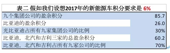 假如我們設(shè)想2017年實行6%的新能源汽車積分政策,在表一中共有9個集團公司有盈余積分。比亞迪的盈余積分占可交易的全部盈余積分的30%。比亞迪、吉利和北汽集團共占市場的70%(表二)。