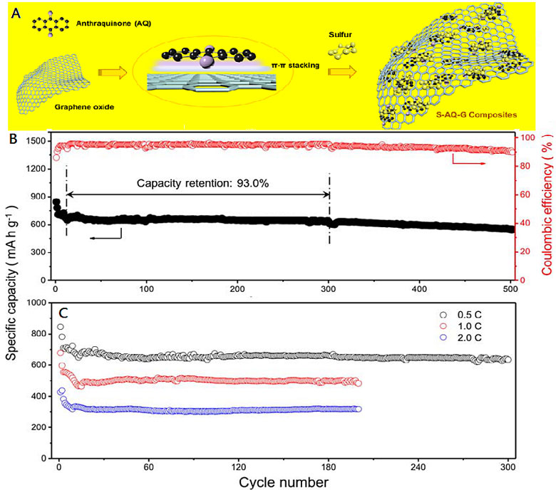 圖1A是蒽醌/石墨烯/硫復(fù)合正極材料制備的示意圖,圖1B和1C是鋰硫電池的充放電性能測(cè)試圖。從圖可知,蒽醌/石墨烯/硫復(fù)合正極材料具有極其穩(wěn)定的循環(huán)能力,在300圈循環(huán)內(nèi),平均每圈容量?jī)H降低0.019%;0.5C充放電500圈后,總?cè)萘咳员3衷诔跏既萘康?1%以上。這種穩(wěn)定的充放電行為意味著天然豐富的蒽醌(AQ)小分子可以有效抑制中間多硫化物的溶解及流失。