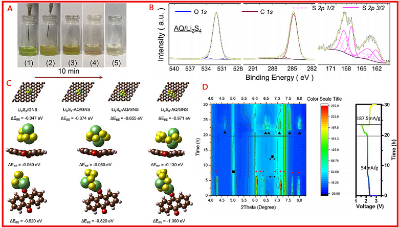 圖2.(A)多硫化鋰溶液中滴加蒽醌分散液的溶液顏色變化圖;(B)多硫化鋰-蒽醌復(fù)合物的XPS成像;(C)密度泛函理論計(jì)算及(D)多硫化鋰-蒽醌復(fù)合物的原位X射線表征。