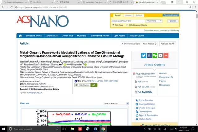 近日,美國化學(xué)學(xué)會(huì)旗艦期刊ACS Nano刊發(fā)我校重質(zhì)油國家重點(diǎn)實(shí)驗(yàn)室吳明鉑團(tuán)隊(duì)在碳基復(fù)合儲(chǔ)能材料領(lǐng)域的最新研究成果“Metal-Organic Frameworks Mediated Synthesis of One-Dimensional Molybdenum-Based/Carbon Composites for Enhanced Lithium Storage”(金屬有機(jī)框架材料輔助合成高儲(chǔ)鋰性能的一維鉬基化合物/碳復(fù)合材料)。該成果提出一種新型構(gòu)筑高性能碳基復(fù)合儲(chǔ)能材料的方法,對設(shè)計(jì)合成新一代電池電極材料具有重要指導(dǎo)意義和參考價(jià)值。我?;瘜W(xué)工程與技術(shù)專業(yè)2015級(jí)碩士研究生田巍為第一作者,吳明鉑教授為通訊作者,中國石油大學(xué)(華東)為第一署名單位。