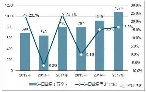 2012-2017年中國鉛酸蓄電池進口數(shù)量統(tǒng)計圖