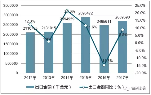 2012-2017年中國鉛酸蓄電池出口金額統(tǒng)計圖