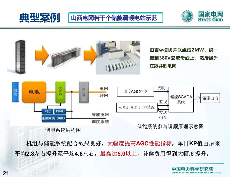 剛才就是調(diào)頻的基本概念和邏輯。下面我介紹幾個(gè)典型的案例。大家知道做調(diào)頻,也不是什么新鮮事物,在國外有好多比如在美國有9MW的調(diào)頻工程,在韓國目前是最大的,有56MW的儲(chǔ)能調(diào)頻,當(dāng)然調(diào)頻是由好幾部分組成的。中國人民做得也可以,在石景山有調(diào)頻電站,KP值也比較高,只不過火電機(jī)組原因現(xiàn)在關(guān)停了,不過這是商業(yè)模式的問題,技術(shù)還是基本可行的。