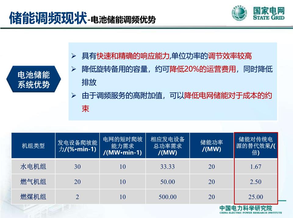 我們看一個(gè)周期之內(nèi),你跟這個(gè)指令怎么樣,這是我調(diào)頻指令下來之后,你跟不跟得上,你看這個(gè)誤差、延遲經(jīng)常有,所以,火電調(diào)頻確實(shí)實(shí)實(shí)在在地碰到了相應(yīng)的問題,急需找一種方法去提升。這個(gè)時(shí)候,儲(chǔ)能就應(yīng)運(yùn)而生。儲(chǔ)能最大的優(yōu)點(diǎn),響應(yīng)時(shí)間是百毫秒級(jí),很快。大家可以看出,這是儲(chǔ)能的指令,我跟你幾乎都能跟得上,所以儲(chǔ)能參與調(diào)頻的好處是:精度高、速度快,各方面都很強(qiáng)。有國內(nèi)的學(xué)者對(duì)儲(chǔ)能調(diào)頻能力進(jìn)行了量化,現(xiàn)在業(yè)界有這么兩種說法:一種是“儲(chǔ)能的調(diào)頻能力相當(dāng)于常規(guī)火電機(jī)組的25倍”;還有一種說法是“儲(chǔ)能的調(diào)頻能力相當(dāng)于常規(guī)火電機(jī)組的17倍”。我個(gè)人建議是中間值,25倍可能有點(diǎn)過了。從這個(gè)道理上講,就把儲(chǔ)能參與調(diào)頻的基本原理告訴給大家了,比如讓一個(gè)人從五樓直接跳到一樓肯定不行,有儲(chǔ)能在的話,搞一堆臺(tái)階,慢慢下來就沒事。所以有儲(chǔ)能在以后,可以把你的K1、K2、K3得到提升,使得綜合KP值得到提高。