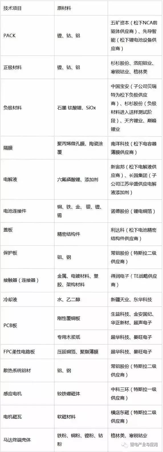 松下產(chǎn)電池正極材料供應(yīng)商為住友(Sumitomo),而鎳、鈷、鋁等原材料供應(yīng)商則是來自中國(guó)的杉杉股份、洛陽鉬業(yè)、寒銳鈷業(yè)和格林美四家公司;