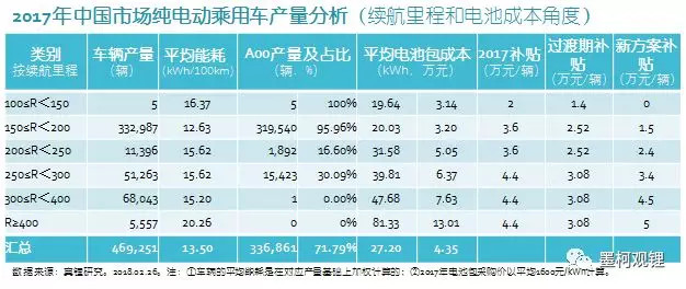 上表是真鋰研究統(tǒng)計(jì)的從續(xù)航里程角度看的2017年生產(chǎn)的純電動(dòng)乘用車的情況。這個(gè)表其實(shí)向我們提供了很多信息。比如,續(xù)航里程150km以下產(chǎn)品的平均能耗是16.37kWh/100km,而150-200km產(chǎn)品則一下子降到了12.63 kWh/100km,為什么會(huì)有這種現(xiàn)象?從產(chǎn)量看,前者只生產(chǎn)了5輛,而后者生產(chǎn)了33.3萬輛,占全部純電動(dòng)乘用車產(chǎn)量的71%。2017年大量的產(chǎn)品集中在150-200km這個(gè)檔次,一方面表明該檔的補(bǔ)貼政策相對(duì)來說最為有利可圖(上表也體現(xiàn)了這一點(diǎn)),另一方面,這類車的96%是微型A00級(jí)產(chǎn)品,由于A00級(jí)產(chǎn)品的整備質(zhì)量較輕,安全要求也相對(duì)較低,加上該類產(chǎn)品的生產(chǎn)廠商數(shù)量眾多,大家群策群力去探索安全的邊界以獲取更高的收益,平均能耗較150km以下類別顯著降低就是這種極致探索的結(jié)果。