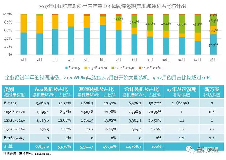 從上面的圖表可以看到,2017年電池包能量密度在105Wh/kg以下的車輛的鋰電裝機(jī)占比高達(dá)50.7%,超過了一半,如果新政在2017年實(shí)施的話,這部分裝機(jī)量對(duì)應(yīng)的車輛是無法獲得一分錢補(bǔ)貼的;而能夠獲得基礎(chǔ)系數(shù)1以上的占比也只有28.92%。鮮明體現(xiàn)了新政在能量密度方面的大躍進(jìn)。雖然從月份進(jìn)展來看,去年后4個(gè)月的裝機(jī)表現(xiàn)使得新政的推出也有它的合理性,但是,后4個(gè)月的車輛目前為止并沒有多少上路的實(shí)證數(shù)據(jù),安全系數(shù)是否足夠尚未可知,這種情況下就迫不及待進(jìn)一步大幅提升能量密度要求,可能欠妥。