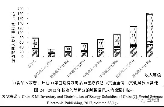 為了研究能源補貼在不同收入等級居民中的分配效應,Chen(2017)計算了不同收入等級的城鎮(zhèn)居民得到的能源補貼(如圖 24)。從消費結構來看,能源補貼主要來自交通通信消費和食品消費,分別占能源補貼總額的52.75%和31.34%,其他幾類消費中能源補貼的比重都較低。從收入等級來看,收入水平越高的居民從各種產品及服務的消費中得到的能源補貼越多,最高收入戶人均能源補貼是最低收入戶的5.71倍,所以,能源補貼是“累退”的。
