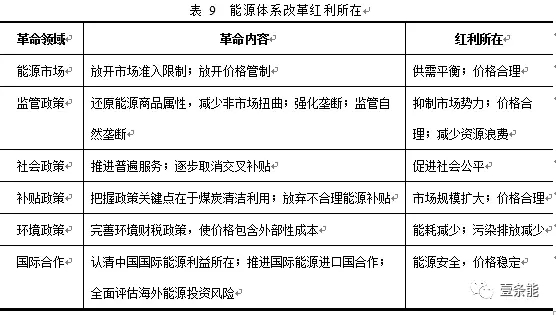 上述能源領域中的不充分、不平衡問題,既是問題所在,也是改革紅利的潛力所在。通過還原能源商品屬性的等改革,能源價格將反映真實成本和市場供需關系,從而釋放正確的價格信號引導市場的運行;市場勢力將得到抑制,能源交易的收益在生產者和消費者中合理分配;能源不平等水平將降低,普遍服務水平將不斷提升;能源結構將向更清潔環(huán)保的方向轉變;能源安全將得到保障。能源體系改革紅利如表 9所示: