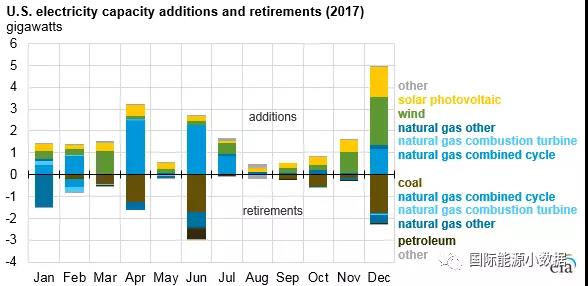 2017年有6.3吉瓦煤電裝機退役,而且全年沒有任何一座新的煤電廠投運,2017年末煤電總裝機為260.3吉瓦。這一年盡管也有4.0吉瓦的天然氣發(fā)電裝機退役,但是新增天然氣裝機9.3吉瓦(其中8.2吉瓦為聯(lián)合循環(huán)機組),年末總裝機為452.8吉瓦。
