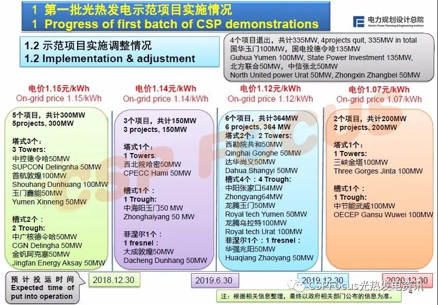 還有4個項(xiàng)目退出示范項(xiàng)目,有2個塔式、2個菲涅爾項(xiàng)目,分別是國華玉門、國電投德令哈、北方聯(lián)合和中信張北,這是目前實(shí)施的整體的情況。
