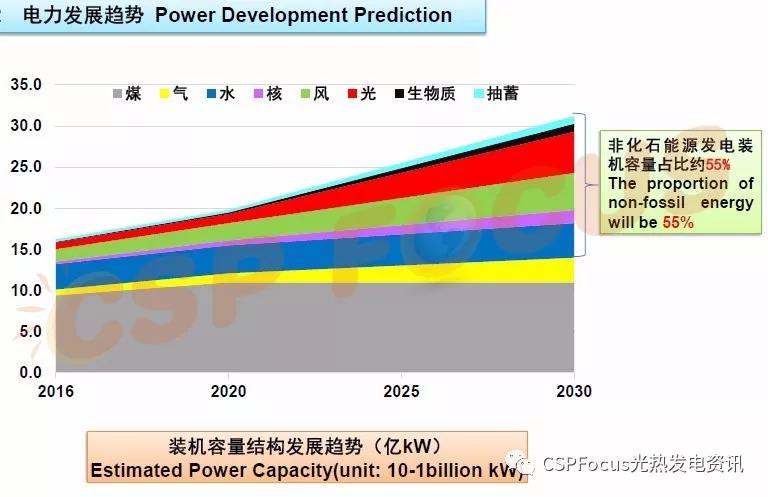如果非化石能源發(fā)電量占比達(dá)到50%,它的裝機(jī)容量要高出5個百分點(diǎn)以上。預(yù)測2030年總裝機(jī)規(guī)模達(dá)到30億千瓦,其中55%是非化石能源發(fā)電裝機(jī)。其中太陽能發(fā)電可能要達(dá)到5億千瓦,去年年底達(dá)到1.3億千瓦,還有接近4億千瓦的裝機(jī)容量。其中,光熱發(fā)電要占相當(dāng)大的比重。因?yàn)樵跊]有儲能的情況下,光伏發(fā)電的棄光問題難以得到很好的解決,而光熱發(fā)電具有穩(wěn)定的功率輸出和可調(diào)節(jié)特性,這就決定了它在我國未來非化石能源發(fā)電里占有重要位置。