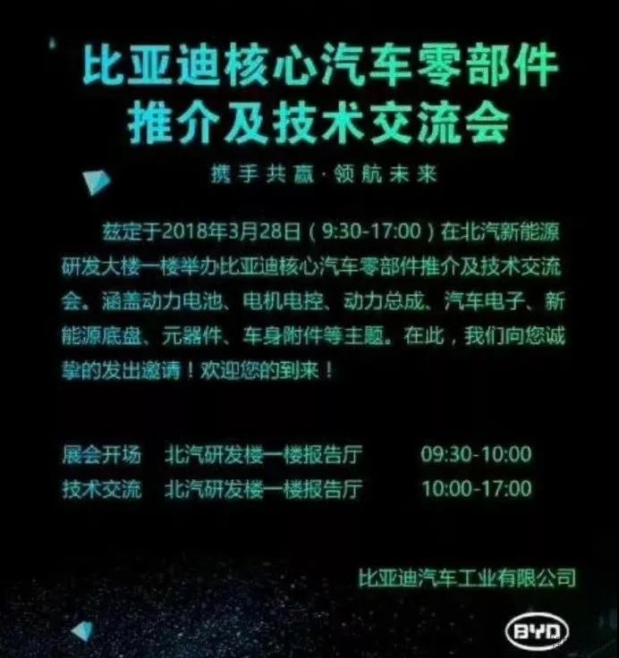 有消息稱,比亞迪將在北汽新能源研發(fā)大樓舉辦比亞迪核心汽車零部件推介及技術(shù)交流會,其中竟涵蓋了動力電池、電機電控、動力總成、汽車電子、新能源底盤、元器件、車身附件等主題。這個交流會的地點以及內(nèi)容都相當耐人尋味。