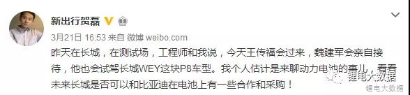 2018年3月20日,有媒體報道稱,比亞迪董事長王傳福到訪保定,長城老總魏建軍親自接待,并且還試駕了長城旗下的WEY P8新能源SUV。長城總裁魏建軍以自己姓氏為品牌,由前寶馬設計師傾力打造的打造“WEY”品牌,是長城決戰(zhàn)在新能源汽車未來的重磅武器。