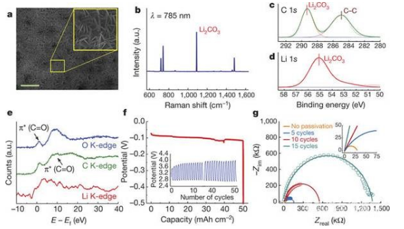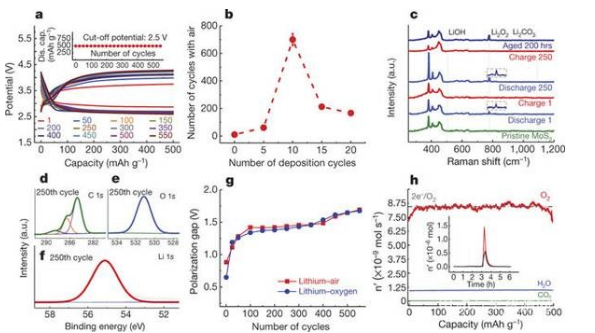 近日,在伊利諾伊大學(xué)芝加哥分校Amin Salehi-Khojin教授和阿貢國家實驗室Larry A. Curtiss教授(共同通訊作者)的團(tuán)隊帶領(lǐng)下,與伊利諾伊理工大學(xué)和加利福尼亞州立大學(xué)合作,采用了兩種策略來限制在含有代表性量的O2,N2,CO2和H2O的模擬空氣氛圍中的鋰-氧電池中的副反應(yīng)。首先,團(tuán)隊開發(fā)了Li2CO3/C涂層鋰陽極僅允許鋰陽離子通過,從而保護(hù)陽極免受模擬空氣的成分影響。其次,基于先前報道的二硫化鉬納米薄片構(gòu)建陰極,并使用離子液體1-乙基-3-甲基咪唑四氟硼酸鹽(EMIM-BF4)和二甲基亞砜(DMSO)的混合物作為電解質(zhì)。該系統(tǒng)的組件一起運行,以防止在CO2和H2O存在下形成副產(chǎn)物。在模擬空氣環(huán)境中作為鋰空氣電池工作,循環(huán)壽命長達(dá)700次。相關(guān)成果以題為“A lithium–oxygen battery with a long cycle life in an air-like atmosphere”發(fā)表在了Nature上。