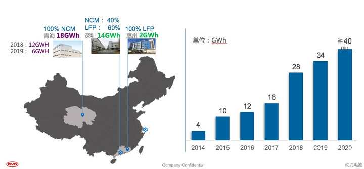 2019年青海基地建成后,比亞迪在中國的動力電池年產(chǎn)能可達到34GWh。青?;厝可a(chǎn)三元電池,年產(chǎn)能高達18GWh;深圳基地年產(chǎn)能14GWh,三元電池占40%;而比亞迪惠州基地則專注于磷酸鐵鋰電池的生產(chǎn),年產(chǎn)能為2GWh。
