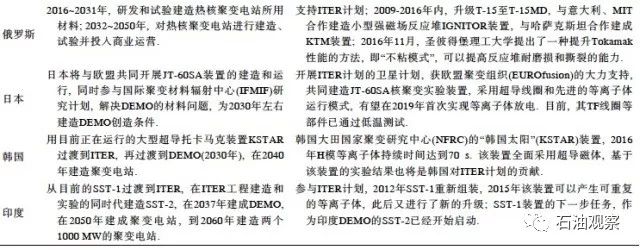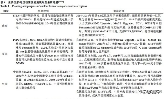 歐盟作為ITER的主導(dǎo), 引領(lǐng)著全球可控核聚變研究, 在ITER建造同時, 持續(xù)資助中型Tokamak等離子體物理、材料、工程方面的研究;還在籌劃穩(wěn)態(tài)聚變示范電站(DEMO)的設(shè)計與建造, 計劃2044年開始發(fā)電, 2050年實現(xiàn)可控核聚變發(fā)電的商業(yè)化。美國同時重視磁約束及慣性約束兩種方式,目標(biāo)是30年后建成DEMO,目前已利用192束高能激光聚焦到氫燃料球上點燃核聚變反應(yīng),取得了輸出能量超過輸入能量的重要突破。中國在可控核聚變領(lǐng)域投入僅次于美國, EAST裝置在2017年7月獲得101。2s的穩(wěn)態(tài)高約束等離子體放電;正在設(shè)計建造中國聚變工程實驗堆(CFETR),預(yù)計2040年建成DEMO,2050年左右實現(xiàn)商業(yè)化。此外, 俄羅斯、日本、韓國、印度等國家也非常重視可控核聚變研究,均參與到ITER計劃中, 并分別提出了2030~2040年前后建成本國的DEMO。世界各國在可控核聚變領(lǐng)域的相互合作與競爭,必將進一步推動可控核聚變技術(shù)的開發(fā)利用(表1)。