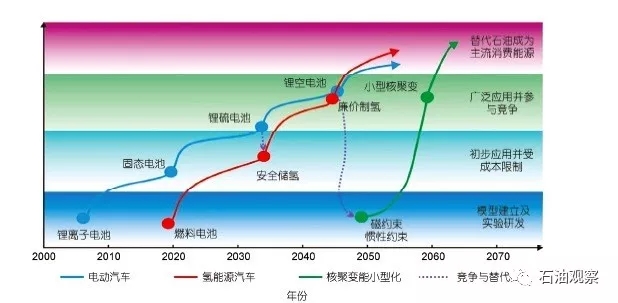 中國儲能網(wǎng)訊;短期內(nèi)石油作為全球第一大消費能源的地位難以撼動, 但隨著能源領(lǐng)域材料與技術(shù)創(chuàng)新發(fā)展以及人類對生態(tài)環(huán)境保護日益提高, 石油作為交通運輸燃料被替代的可能性與日俱增。推測替代石油的可能路徑有三: (1) 電動汽車。依托高效儲能電池材料與技術(shù)發(fā)展, 2030年以前有望替代燃油汽車; (2) 氫燃料電池汽車。 基于廉價高效氫氣制取與儲運技術(shù), 2030~2050年前后氫燃料電池汽車有望進入發(fā)展快通道, 并可帶領(lǐng)人類走進氫經(jīng)濟時代; (3) 核聚變能源。可控核聚變技術(shù)的突破和小型化, 有望全方位提供交通運輸動力, 或?qū)⒃?050~2060年前后成為覆蓋全領(lǐng)域的主導(dǎo)能源。上述三種路徑能否完全替代石油尚存不確定性, 但是石油在交通運輸領(lǐng)域被大規(guī)模替代已成為大勢所趨。 由燃料應(yīng)用領(lǐng)域轉(zhuǎn)入材料應(yīng)用領(lǐng)域?qū)⒊蔀槭臀磥響?yīng)用的最終歸宿。