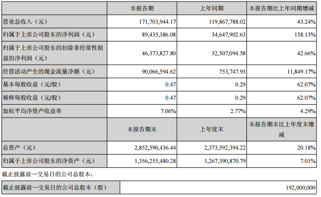 中國儲能網(wǎng)訊:4月10日,星源材質(zhì)發(fā)布了一季度報告,報告顯示,公司實現(xiàn)營業(yè)收入1.72億元,較上年同期增長43.24%,歸屬于上市公司股東的凈利潤8943.54萬元,較上年同期增長158.13%。