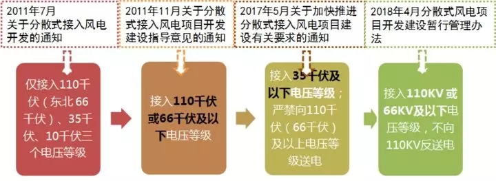 2011年是國內(nèi)分散式發(fā)展的起點,反觀政策出臺的歷程,分散式風(fēng)電管理辦法不斷迭代,其中接入電壓等級范圍不斷調(diào)整。與2017年5月國家能源局文件要求不同,管理辦法將并網(wǎng)消納范圍擴圍至110kv,分散式風(fēng)電獲得更大的消納范圍和更大的裝機成長空間。