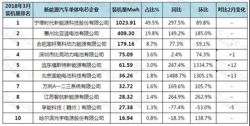 圖1:2018年3月國內(nèi)動(dòng)力電池裝機(jī)量排位前10企業(yè)情況