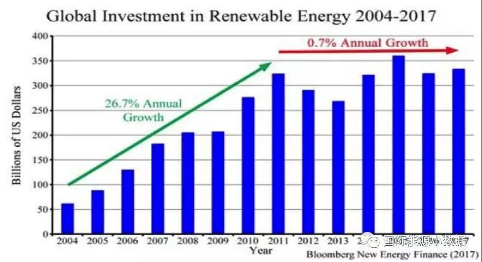 中國儲能網(wǎng)訊:根據(jù)彭博新能源財經(jīng)的數(shù)字,2004年到2011年間全球可再生能源投資年增長率為26.7%。然而,2011年到2017年間全球可再生能源投資增長率僅為0.7%。2017年日本可再生能源投資下降16%、印度下降20%、德國下降26%、英國下降56%。美國小幅增長1%,而中國大增30%(1330億美元)??梢哉f,如果不是因為中國的巨大貢獻,全球的可再生能源投資其實是在下降的。