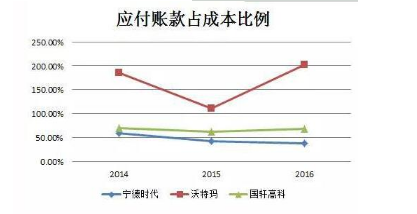 2014到2016年,寧德時代的應(yīng)付賬款為3.85億、14.72億、31.73億;占營業(yè)成本的比例為59.78%、42.07%、37.88%。