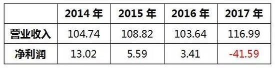 2017年年報(bào)顯示,公司2017年?duì)I業(yè)收入116.99億元,虧損41.59億元,較上年同期下降-1,318.77%。讓人納悶的是,2017年是近4年?duì)I業(yè)收入最高的一年,怎么還虧損近42億元?2014年?duì)I業(yè)收入104億元,凈利潤還達(dá)到13億元,2015年、2016年?duì)I業(yè)收入均在100億元以上,但凈利潤不到2014年的50%,分別為5.59億元、3.41億元。2017年?duì)I業(yè)收入創(chuàng)近4年的新高,凈利潤卻往相反方向創(chuàng)新高,巨額虧損近42億元。