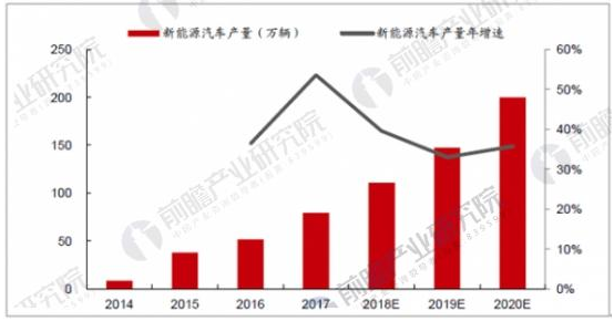 據(jù)前瞻產(chǎn)業(yè)研究院發(fā)布的《新能源汽車行業(yè)戰(zhàn)略規(guī)劃和企業(yè)戰(zhàn)略咨詢報(bào)告》數(shù)據(jù)顯示,2017年,我國(guó)新能源汽車產(chǎn)量為79.4萬(wàn)輛,同比增長(zhǎng)53.8%,占當(dāng)年汽車行業(yè)總產(chǎn)量(2,902 萬(wàn)輛)的比例卻僅為2.74%。新能源汽車市場(chǎng)尚處于發(fā)展早期,未來(lái)受益政策推動(dòng)、科技創(chuàng)新,產(chǎn)業(yè)快速成長(zhǎng)的勢(shì)頭未來(lái)仍將持續(xù)十年甚至幾十年。預(yù)計(jì),2018~2020年,我國(guó)新能源汽車產(chǎn)量將分別達(dá)到110.8萬(wàn)輛、147.4萬(wàn)輛、200萬(wàn)輛,保持快速增長(zhǎng)勢(shì)頭。