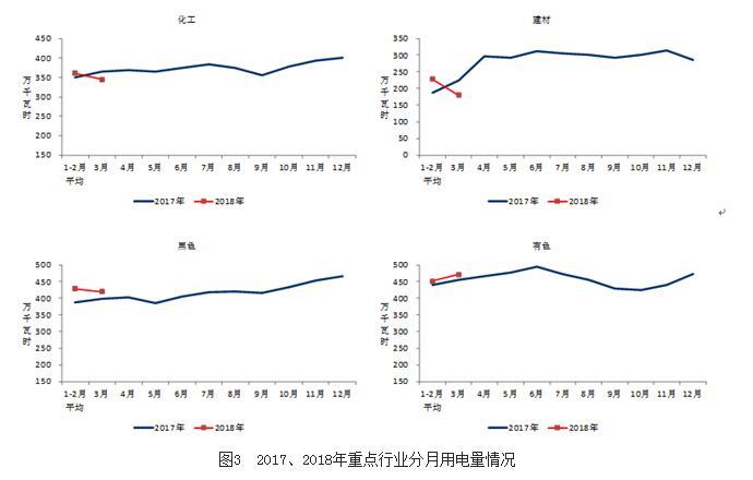 3月份,四大高載能行業(yè)用電量合計(jì)1416億千瓦時(shí),同比下降1.2%,占全社會(huì)用電量的比重為26.6%。其中,化工行業(yè)用電量345億千瓦時(shí),同比下降1.9%;建材行業(yè)用電量181億千瓦時(shí),同比下降19.5%;黑色金屬行業(yè)用電量420億千瓦時(shí),同比增長(zhǎng)5.5%;有色金屬冶煉行業(yè)471億千瓦時(shí),同比增長(zhǎng)2.5%。