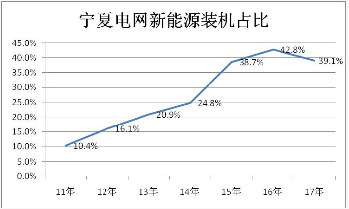 寧夏新能源在國家宏觀政策引導(dǎo)下發(fā)展較早,2003年首座風(fēng)電場投運(yùn),2008年首座光伏電站投運(yùn)。進(jìn)入“十二五”,寧夏新能源發(fā)展迅猛,裝機(jī)年均增長率為67.4%,增速遠(yuǎn)大于寧夏電網(wǎng)用電負(fù)荷增速,新能源裝機(jī)容量占比也由2011年的10.4%上升至2016年的42.8%,詳見圖1。截止2017年底,寧夏新能源總裝機(jī)容量1529.501萬千瓦,占統(tǒng)調(diào)總裝機(jī)容量的39.10%。其中:風(fēng)電總裝機(jī)容量941.618萬千瓦,與上年底持平,占統(tǒng)調(diào)總裝機(jī)容量的24.07%;光伏總裝機(jī)容量587.883萬千瓦,同比增長16.32%,占統(tǒng)調(diào)總裝機(jī)容量的15.03%。寧夏新能源總裝機(jī)容量在西北五省排名第三(新疆2714萬千瓦、甘肅2068萬千瓦),占比在西北五省排名第二(第一甘肅42.1%)。