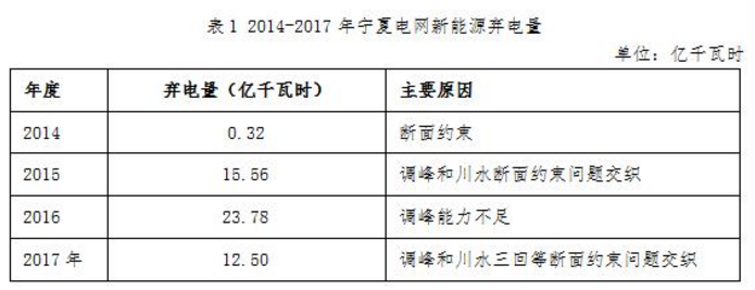 2014年5月寧夏電網(wǎng)首次出現(xiàn)電網(wǎng)斷面引起的新能源棄風(fēng),全年棄風(fēng)電量0.32億千瓦時(shí),棄電率0.49%。進(jìn)入2015年后,因新能源裝機(jī)超過了電網(wǎng)的全額接納能力,3月份首次出現(xiàn)因調(diào)峰能力不足的棄風(fēng),9月份首次出現(xiàn)棄光,調(diào)峰和斷面棄電問題交織,全年棄電15.56億千瓦時(shí),棄電率11.84%。2016年棄風(fēng)棄光成為電網(wǎng)運(yùn)行新常態(tài),全年棄風(fēng)棄光23.78億千瓦時(shí),棄電率11.61%。
