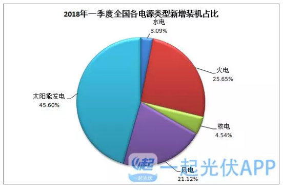 通過上述數(shù)據(jù)可以看出,一季度太陽能新增裝機多達11.36GW,同比增長188.32%。此外,從各電源類型新增裝機占比上來看,太陽能發(fā)電也高達45.60%,位居首位并且遠高于其他電源類型(如下圖所示)。