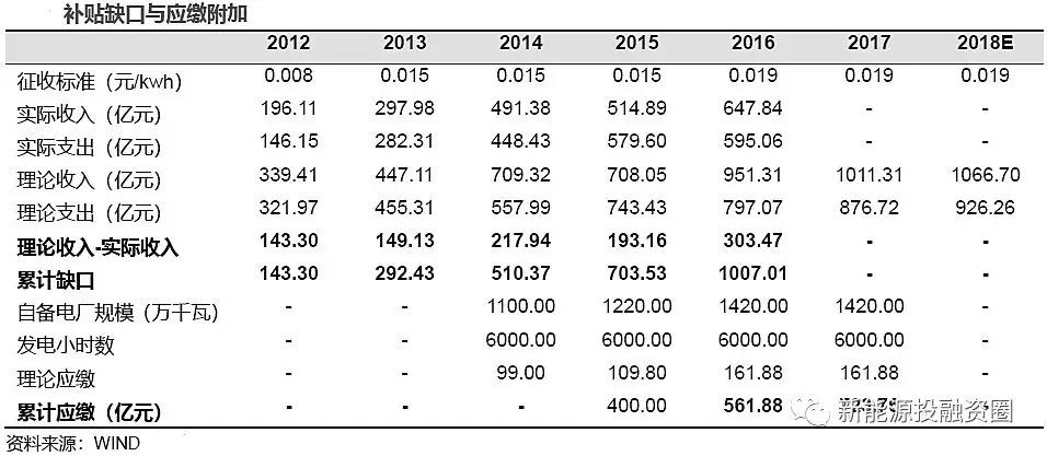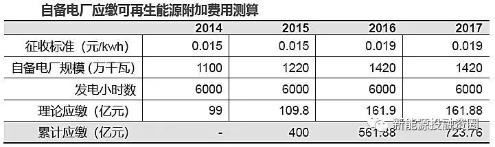 根據(jù)能源局公布的數(shù)據(jù),截至16年底,全國企業(yè)自備電廠裝機(jī)容量超過1.42 億千瓦,15 年為1.22 億千瓦,占全國電力總裝機(jī)的8.6%。其中,自備燃煤機(jī)組裝機(jī)容量1.15 億千瓦,占全部自備機(jī)組裝機(jī)總?cè)萘康?1%。以及發(fā)改委對(duì)自備電廠的整治公告顯示:“十二五”期間自備電廠拖欠可再生能源電價(jià)附加約為400 億元,據(jù)此我們測(cè)算,從2010 年至2017 年自備電廠累計(jì)應(yīng)繳附加費(fèi)約為723.8 億元。由此可見,自備電廠的欠繳費(fèi)用的確是補(bǔ)貼缺口的重要誘因。