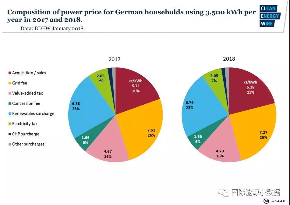 中國(guó)儲(chǔ)能網(wǎng)訊:根據(jù)德國(guó)能源與水務(wù)協(xié)會(huì)發(fā)布的最新數(shù)據(jù),2018年德國(guó)居民(以每年耗電3500千瓦時(shí)計(jì)算)平均電價(jià)為29.42歐分(合人民幣2.3元)/千瓦時(shí),其中上網(wǎng)電價(jià)為6.18歐分/千瓦時(shí)(21.0%)、過(guò)網(wǎng)費(fèi)7.27歐分/千瓦時(shí)(24.7%)、增值稅4.70歐分/千瓦時(shí)(16.0%);特別令人關(guān)注的可再生能源附加費(fèi)為6.79歐分/千瓦時(shí),占電價(jià)的23.1%。德國(guó)居民電價(jià)中的僅可再生能源附加費(fèi)這一項(xiàng)就相當(dāng)于人民幣0.52元/千瓦時(shí),與中國(guó)居民電價(jià)相當(dāng)。