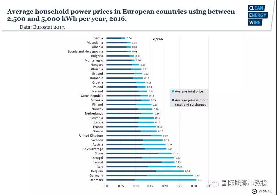 與歐洲其他國(guó)家的居民電價(jià)相比,德國(guó)僅次于丹麥,排在歐盟國(guó)家的第2位。