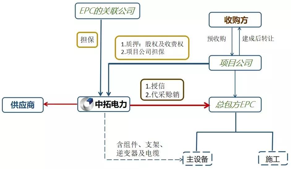 浙江中拓則是從供應(yīng)鏈金融上為光伏電站在建設(shè)期實現(xiàn)融資,供應(yīng)鏈金融的實質(zhì)是幫助企業(yè)盤活流動資產(chǎn)。中拓為光伏電站建設(shè)提供供應(yīng)鏈金融服務(wù),與授信公司簽訂代理采購框架合同,按照光伏電站的施工進度代理采購相應(yīng)物資(組件、逆變器、電纜、支架),代理采購框架合同約定所有物資采購的供應(yīng)商均由授信公司指定,待電站并網(wǎng)發(fā)電后,電站的轉(zhuǎn)讓資金或電站融資租賃用于償還中拓的本息。