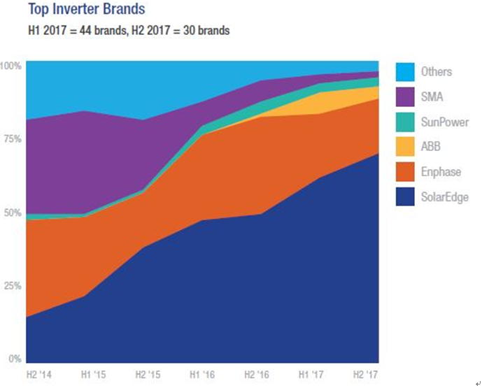 這張圖表顯示SolarEdge公司已成為住宅太陽能發(fā)電設(shè)備的主導(dǎo)品牌。從其尺寸和復(fù)雜性來考慮,其安裝量的增加可能直接歸因于來自SolarEdge公司和公司Enphase的模塊級電子器件。